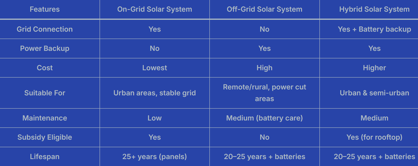 A hybrid solar system combines the advantages of both on-grid and off-grid systems. It not only connects to the grid but also stores excess power in batteries, ensuring your home uses solar energy first, followed by battery backup, and finally grid supply if needed.
